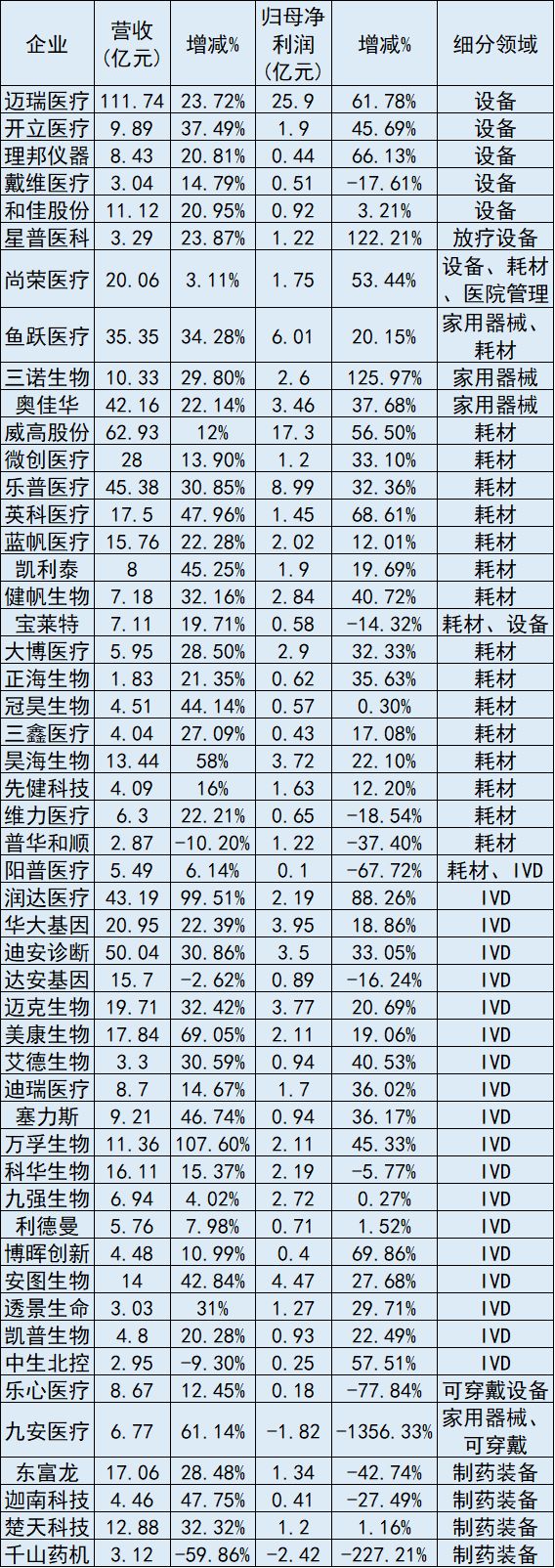 有超過9成的國內(nèi)械企均實(shí)現(xiàn)了營收正增長,其中近7成的營收同比增速還在20%以上,像潤達(dá)醫(yī)療和萬孚生物還實(shí)現(xiàn)了營收翻倍。